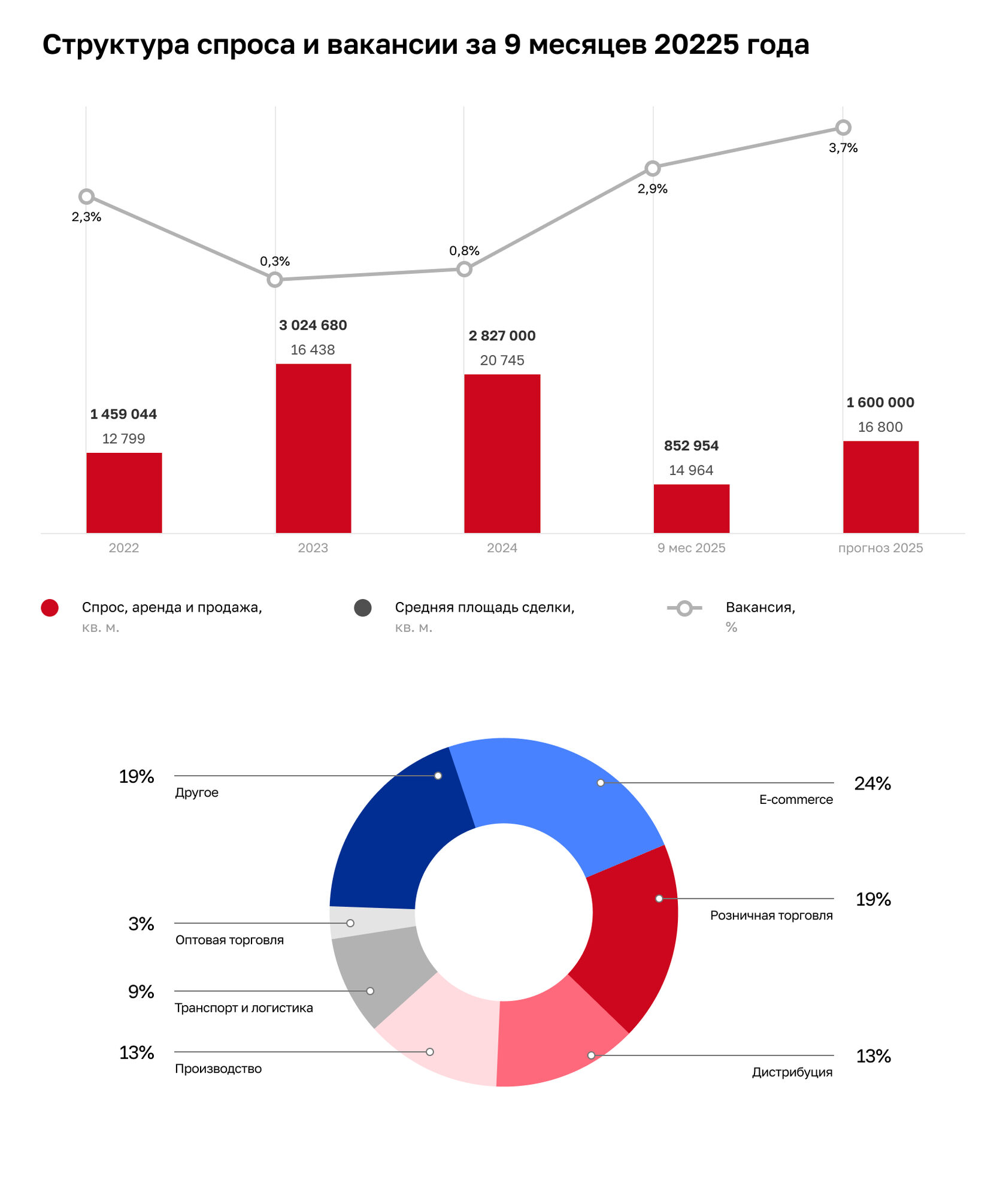 Однако спрос не успевает за предложением и значительно снизится на фоне рекордных 2023 и 2024 годов. На рынке наблюдается тренд субаренды: крупные компании предлагают простаивающие излишки своих площадей. Таким образом, уровень вакансии в готовых к въезду объектах по итогам 9 месяцев 2025 года установился на уровне 2,9%, а по итогам года вырастет на 2,9 п. п. и, по прогнозам, достигнет 3,7%. В некоторых ключевых складских кластерах вакансия уже сегодня превышает 10% — кластер Домодедово (10%), и кластер Новорижский (21%).